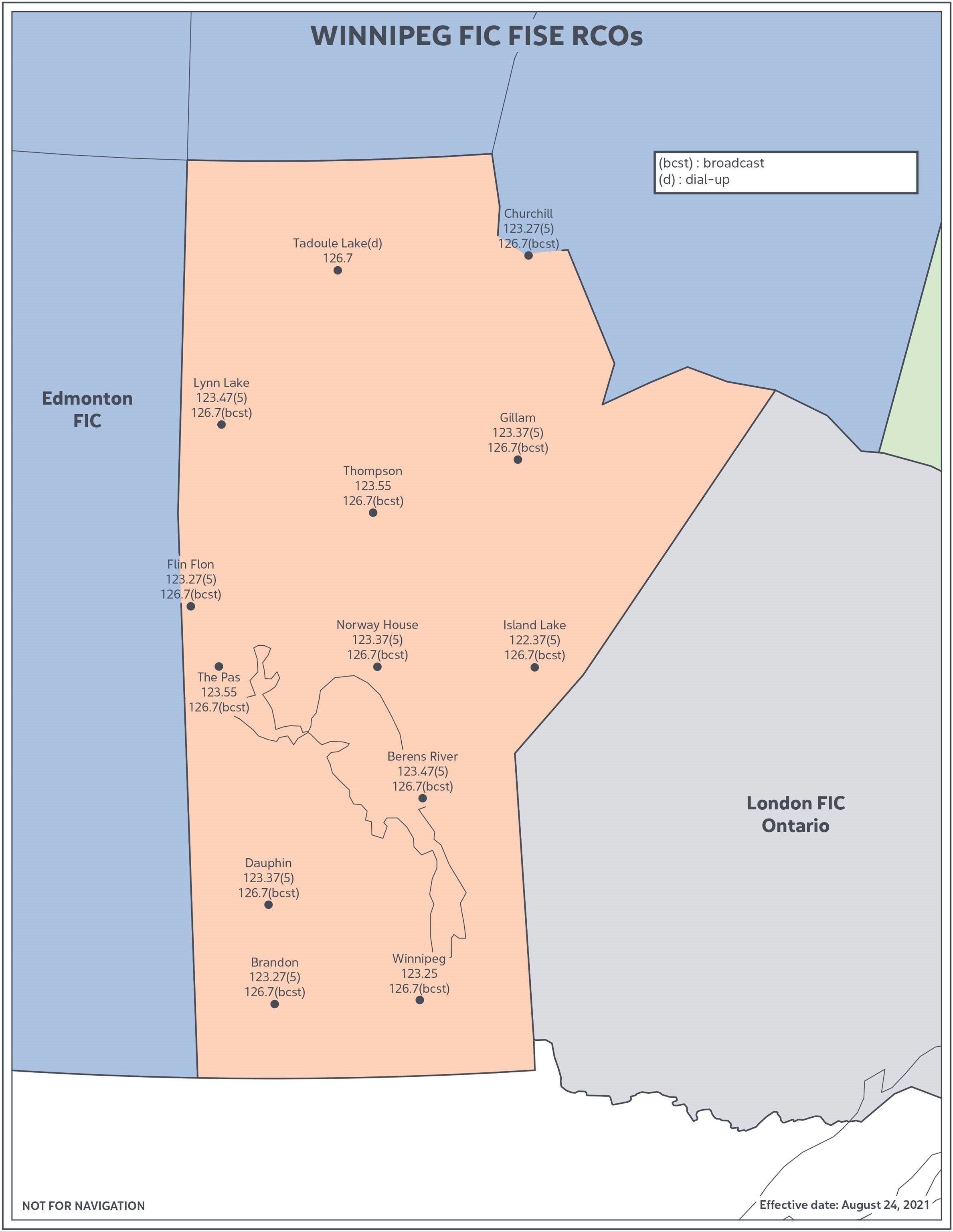 In preparation for the upcoming closure of the Winnipeg FIC, Flight Planning and Alerting Services in north-western Ontario are being transferred to the London FIC. As part of this change some RCOs (call sign “WINNIPEG RADIO”) are being transferred to the London FIC. Pilots requiring Flight Information Services Enroute (FISE) via these RCOs should use the new call sign as follows: